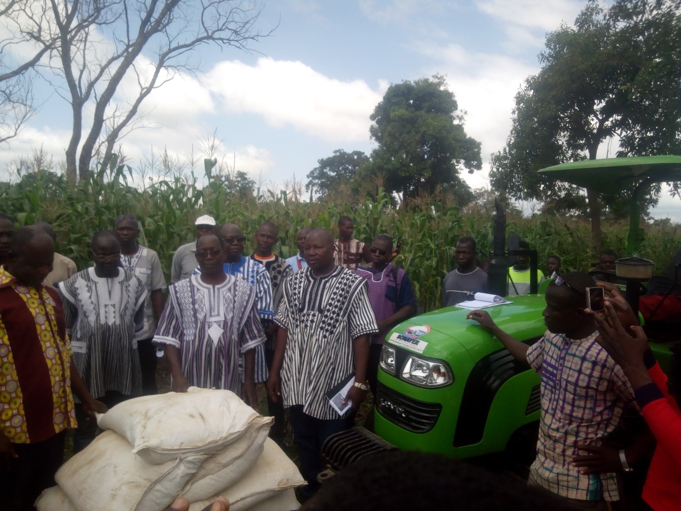 Sur le site de Latara, la délégation a visité l’exploitation de champ de maïs de variété Massongo de M. PALE Sansan Sifilè. Cette exploitation est un modèle. Elle est à un stade de floraison/maturation et présente un bon état phytosanitaire. En effet, Sansan a bénéficié et mis en pratique les conseils des agents techniques de l’agriculture. Il a également bénéficié d’un appui en équipement agricole, à savoir un tracteur, des charrues, des semences certifiées. Sur une superficie emblavée de 10 ha, ce producteur entend obtenir un rendement de 3tonnes à l’hectare. Ce qui lui permettra, en plus de la mise à location de son tracteur, d’obtenir un bénéfice brut de 3 353 000 F CFA en fin de campagne. Afin de moderniser davantage son agriculture et accroître son rendement, M. PALE lance un appel à plus d’accompagnement. En attendant que cette doléance soit mise en pratique, sur place, il bénéficie de plusieurs sacs d’intrants.