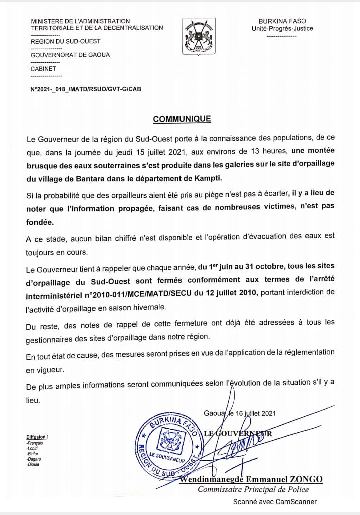 Dans un communiqué parvenu à la rédaction de Bafujiinfos.com, le gouverneur de la région du sud-ouest apporte des précisions relatives à l’incident survenu au site d’or de Bantara dans la commune de Kampti. Le gouverneur dément l’information selon laquelle, l’incident aurait engendré des victimes. Toutefois l’autorité annonce qu’aucun bilan n’est disponible pour le moment et l’opération d’évacuation d’eau se poursuivait.