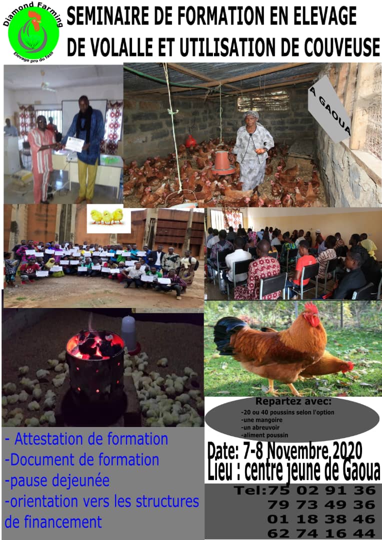 Vous rêvez de devenir éleveur. Eh bien, une opportunité s’offre à vous. Diamond farming-élévage pro du Faso vous propose une formation en élevage de volailles et l’utilisation de couveuse à travers toutes les communes du Burkina Faso.